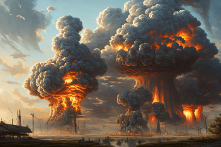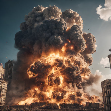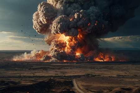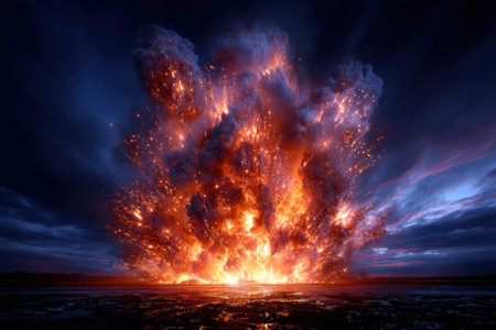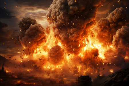 A powerful explosion erupts, creating a stunning display of fireballs and dark smoke against a dramatic sky, evoking feelings of awe and danger.