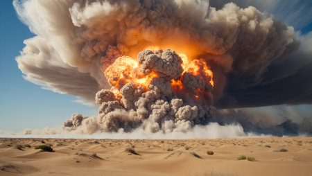 massive atomic explosion sending plumes of smoke and fire into the sky in the heart of the desert.