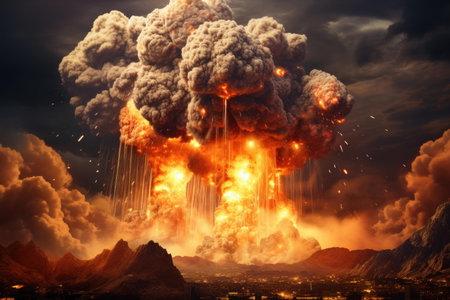 In the tumultuous sky, a nuclear blast casts an eerie glow, whether day or night, Ai Generated.