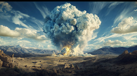 A colossal nuclear explosion generates a massive mushroom cloud, rising above a desolate terrain, illustrating the overwhelming power and impact of nuclear detonations
