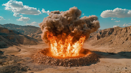 A stunning aerial view of a massive explosion in a remote desert, showcasing fire, smoke, and a dramatic landscape. The image captures the impact and intensity of the moment.