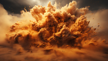 A stunning visualization of an explosion of dust and sand against a bright orange background, capturing the dynamic energy and textures of nature