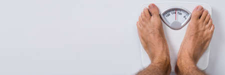 Male feet on the digital weight scales. Standing on the digital scales, the man checks his weight, a vital step in tracking progress towards his fitness goals.