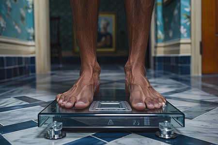 Male feet on the digital weight scales. The mans feet rest on the scales, showcasing a moment of self-reflection and motivation in his fitness journey.