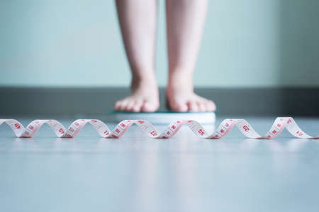 Blured of woman foot standing on weigh scales with tape measure in foreground