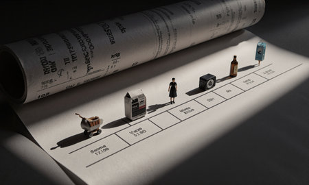 Purchase history timeline Receipt paper unrolled as timeline with miniature products marking purchases, dramatic lighting creates shadow timeline below, products