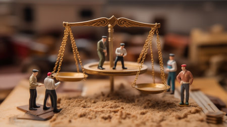 A scale of justice on a table top with workers working in construction site in law concept. beautiful Generative AI AIG32