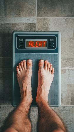 Male feet stand on a scale with Alert sign on display. Health issues, eating disorders concept