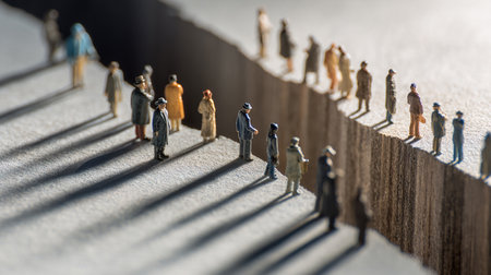 A line of miniature people standing on a white tape measure. Social income gap concept.