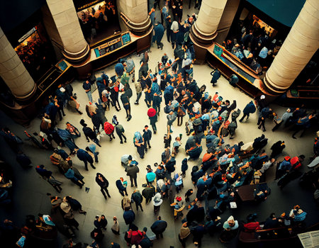 An AI generated illustration of a diverse group of people standing in a circle in a large hall