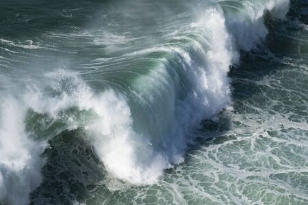 Ocean Waves crashing water power along beach coastline from storm weather.