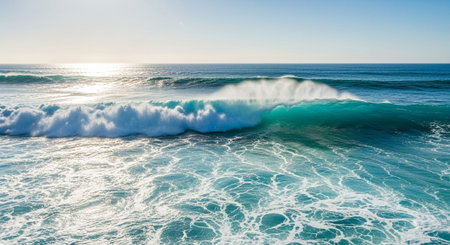Turquoise waves surge powerfully, creating frothy white caps under bright sunlight, showcasing ocean's energy.