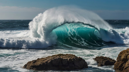 A vibrant, rolling sea crest erupts with force, its deep blue hues contrasted by a luminous sky, embodying the raw energy and mesmerizing allure of the ocean.
