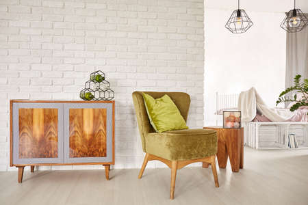Wooden commode and armchair in living room interior