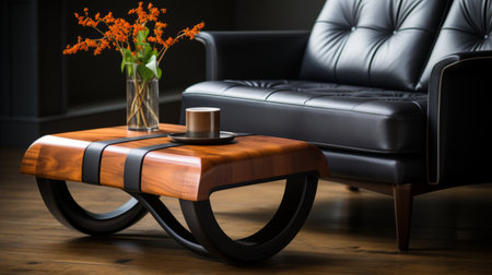 a black leather couch, influenced by zen buddhism, sits in the corner alongside a coffee table. this captivating photo, taken with a nikon d750, showcases organic biomorphic forms and varying wood grains. the industrial and product design elements are evident through bold curves and lively tableaus. ai generated