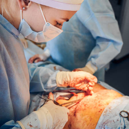 Close up of plastic surgeon and assistants doing plastical surgical operation in hospital, using medical instruments. Focus on wound on patients abdomen. Concept of abdominoplasty and plastic surgery