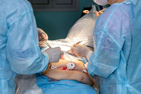 Operation close up. Breast augmentation surgery in the operating room