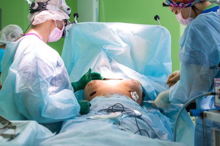 Surgeons team working with patient. breast augmentation