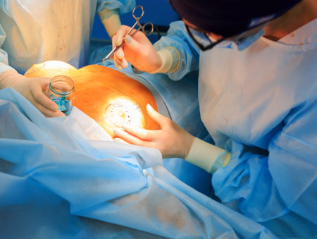 Close-up breast augmentation surgery in the operating room surgeon tools implant