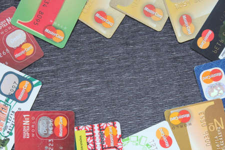 credit cards with Mastercard brand logo with empty middle for text. Close up of many Mastercard credit cards. Plastic bank cards of Mastercard. International payment systems