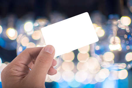 Male hand holding blank plastic credit card or business card on black isolated studio background. Banking services and acquaintance concept, copy space, cutout, low key