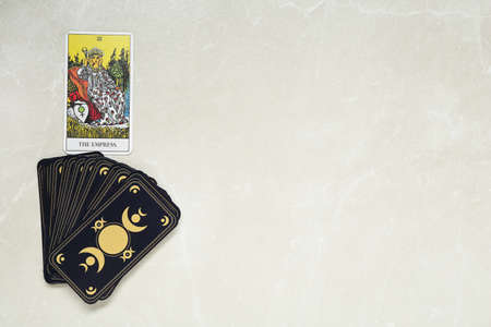 The Empress and other tarot cards on light table, flat lay. Space for text