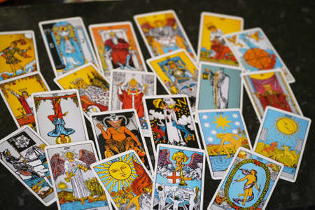 pile of tarot cards jumbled, scattered and haphazardly arranged.