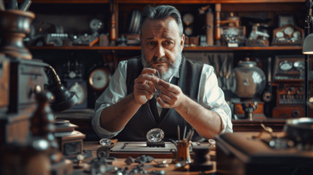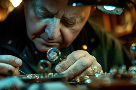 Jeweler examines the faces of a diamond through a loupe in a dimly lit workshop for quality assessment AI