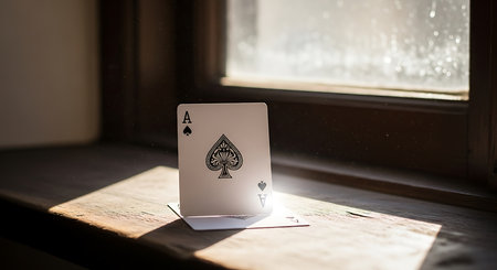 Playing cards on a wooden table with a window and a window.