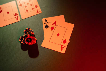 four of a kind of aces on a pile of gaming chips on the green table in the casino