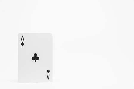A close up macro shot of a single black Ace of Spades playing card angled against a stark white background, highlighting its detailed and decorative symbol.