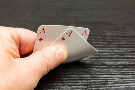 hand hold two red aces poker, the best pocket pair on a black background copy space. close up