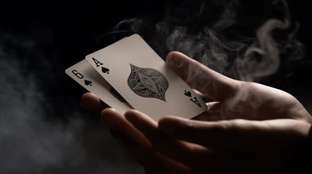 hand holding playing cards on black background