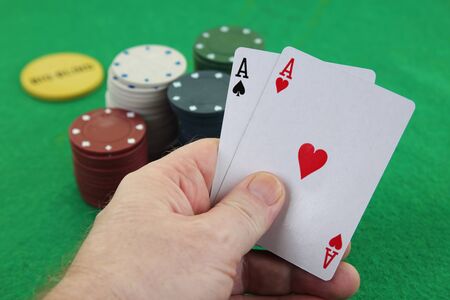 A hand holding a pair of aces with casino chips in background Texas holdem poker best pocket rockets american airlines
