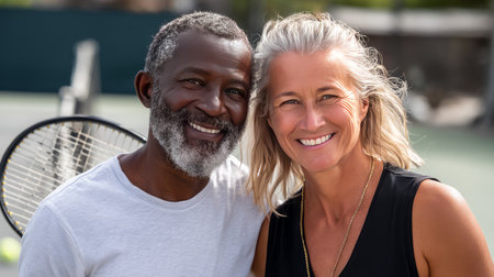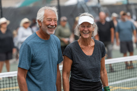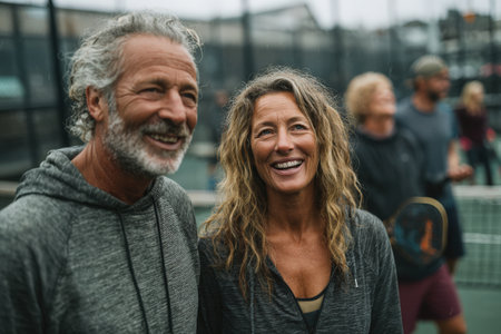 Happy couple with gray hair, dressed in comfortable athletic clothing, sharing a joyful moment on a tennis court, with players and spectators in the background