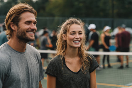 Young couple enjoying a lively moment on a tennis court, with players and spectators in the background, capturing the excitement of sports and camaraderie