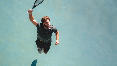 An athlete is seen mid-air, executing a tennis serve or overhead shot. The image captures motion and athleticism with a focus on form. The composition utilizes a wide angle and top-down perspective, emphasizing the subject against a gradient background. This image could be suitable for fitness, sports, or lifestyle publications.