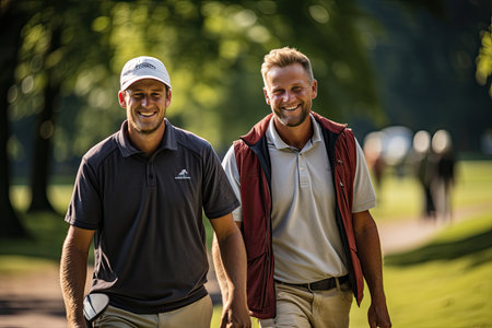 Two individuals are seen walking across a verdant golf course, carrying golf equipment. The scene showcases natural light and a composition featuring the figures set against a backdrop of trees and sky. This image is suitable for various commercial uses, including sports-related advertising or editorial content.