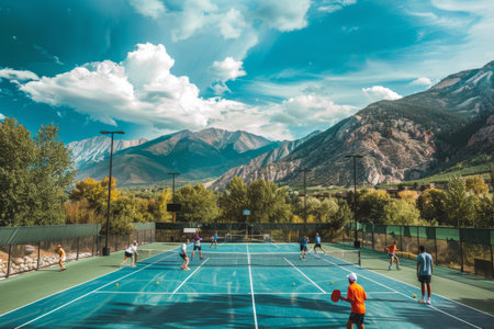 A group of players engaged in tennis match on a vibrant tennis court with competitive spirit and focus, A group of players competing on a vibrant pickleball court with a picturesque mountain backdrop