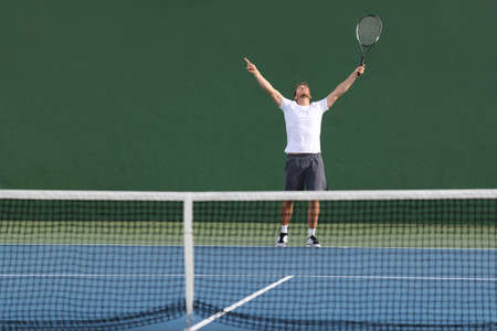 Tennis player man winning match happy excited with arms up in success on green outdoor court.