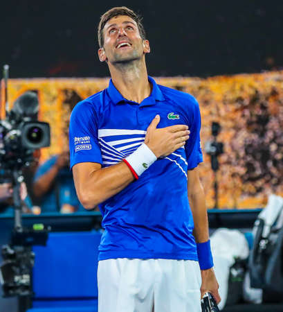 MELBOURNE, AUSTRALIA - JANUARY 25, 2019: 14 time Grand Slam Champion Novak Djokovic celebrates victory after his semi-final match at 2019 Australian Open in Melbourne Park
