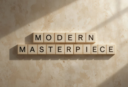 A visually striking arrangement of letters spelling out Modern Masterpiece, creating an artistic vibe on a textured wall backdrop illuminated by soft light.