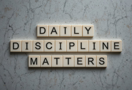 A motivational layout featuring the phrase Daily Discipline Matters in letter tiles on a stone background, perfect for themes of self-improvement and personal growth.