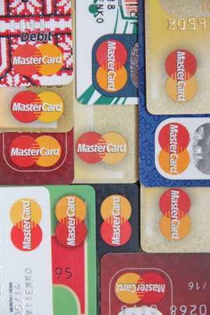 different credit cards with Mastercard brand logo. Close up of many Mastercard credit cards. Plastic bank cards of Mastercard. International payment systems