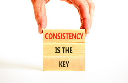 Consistency is the key symbol. Concept words Consistency is the key on beautiful wooden blocks. Beautiful white background. Businessman's hand. Business consistency is the key concept. Copy space.
