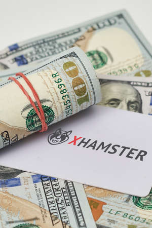 Tashkent, Uzbekistan - 22 November, 2021: Pile of us dollars and Xmaster card. Xmaster adult website logo on card and cash money