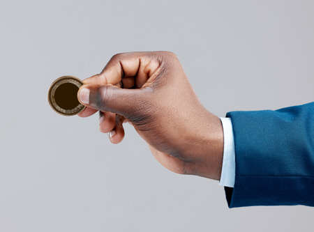 The coin that could change your life. Studio shot of a businessman holding a bitcoin against a grey background.
