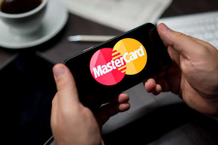 New York, New York / USA - 11 11 2019: Logo of Mastercard on the iPhone X in hands in office