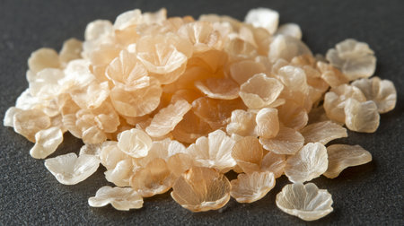 A heap of translucent shellac flakes, amber-toned, displaying a delicate, petal-like texture and a subtle, natural sheen.