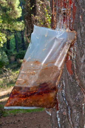 Bags attached to a pine tree collecting the Resin